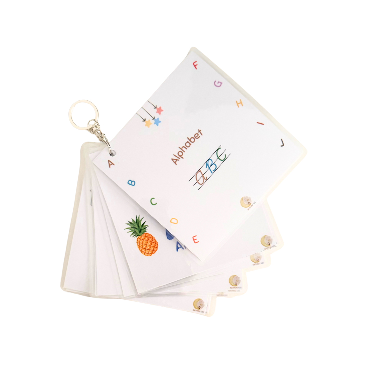 Chaque carte présente une lettre, un mot et une illustration correspondante (ex : A pour Ananas, B pour Bonnet).