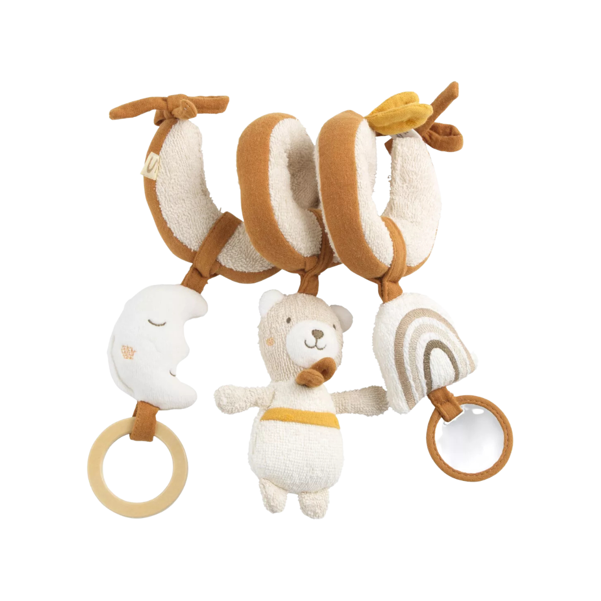 Avec ses textures variées, ses couleurs tendres et ses petits jouets suspendus, cette spirale en 100 % coton bio stimule les sens de bébé dès les premiers mois. Facile à fixer sur lit, parc, siège auto ou poussette, elle accompagne bébé partout !